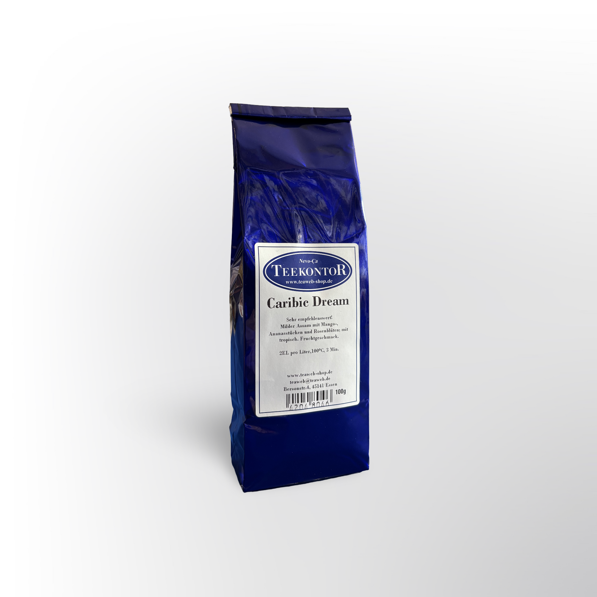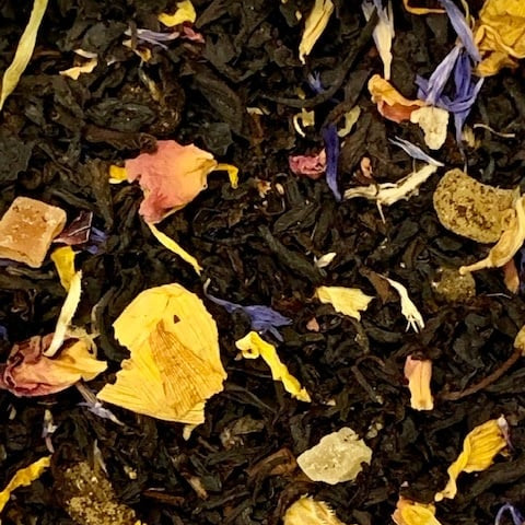 Mild Assam tea with mango and pineapple pieces and rose petals, offering a tropical fruit flavor. Highly recommended as iced tea as well.