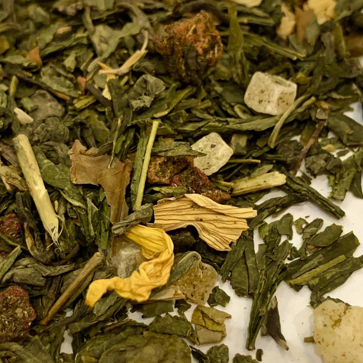A blend of mild green and white teas with pineapple and strawberry pieces.