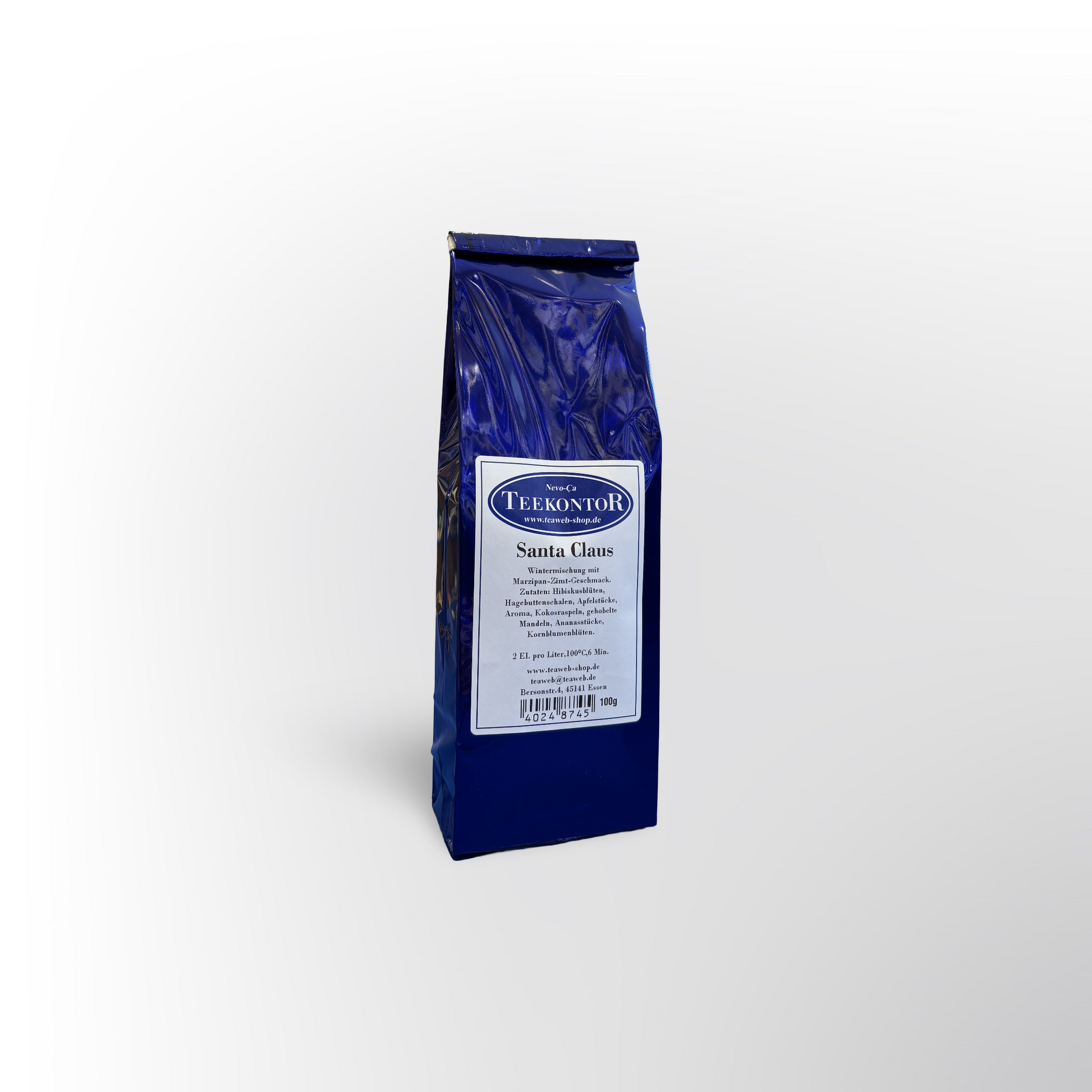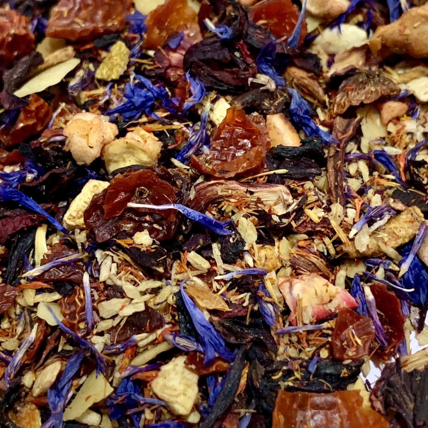 Our delicious Christmas mix with hibiscus blossoms, rosehip peels, apple pieces, orange peel, coconut flakes, slivered almonds, pineapple pieces, safflower, and cornflower blossoms! The taste is reminiscent of a blend of cherry, marzipan, and cinnamon! Simply divine!