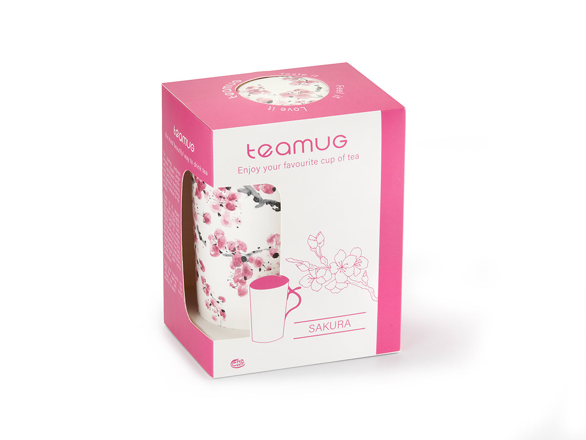 Double-walled porcelain cup with matching tea filter and lid. In an elegant floral design.