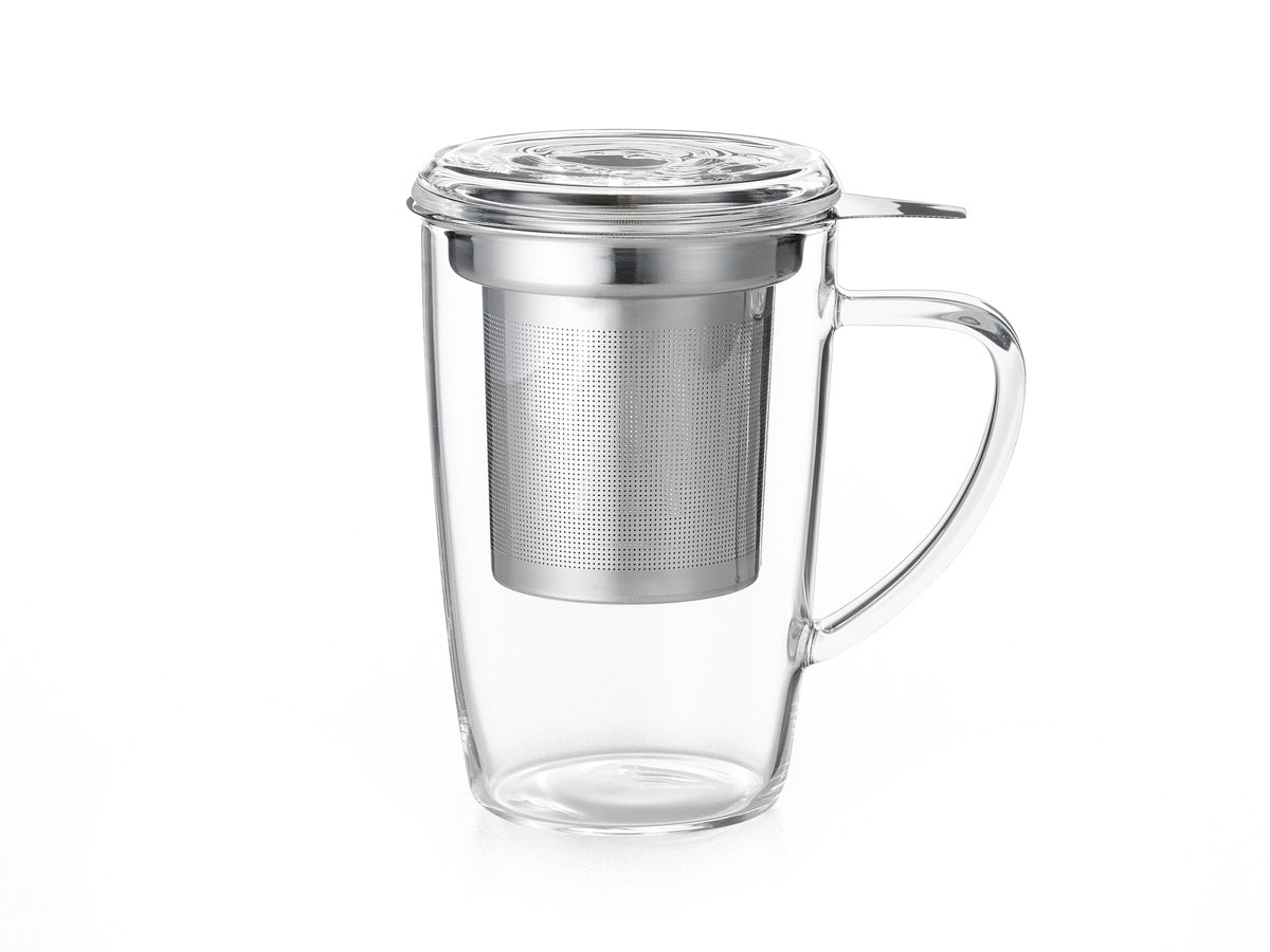 Glass teacup with glass lid and matching stainless steel strainer. In a timeless and classic design.